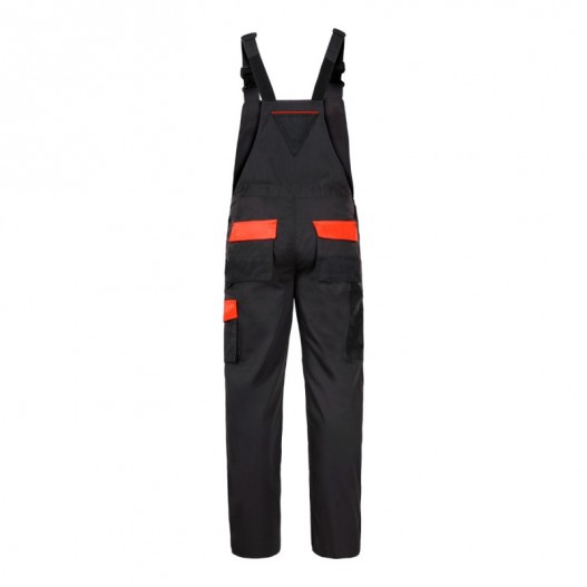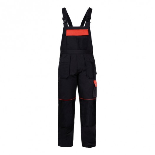 11 buzunare, dintre care 7 cu prindere prin arici. Buzunar pentru telefonul mobil. Cusaturi triple. Talie ajustabila cu nasturi si elastic. Inel fixare cheie. Banda suport ciocan. Bretele ajustabile. Buzunare pentru genunchiere. Portiuni intarite pe buzunare si genunchi, dintr-un material rezistent la uzura (poliester 300D). Standard EN ISO 13688.