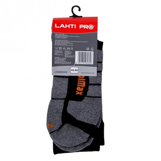 Material: - 60% bumbac, 30% poliester (Coolmax®), 5% poliester, 5% elastan. Fibrele din poliester Coolmax permit pielii sa respire si o pastreaza uscata. Portiuni elastice pentru a evita alunecarea. Mansete elastice. Potrivire perfecta pe forma piciorului. Standard EN ISO 13688.