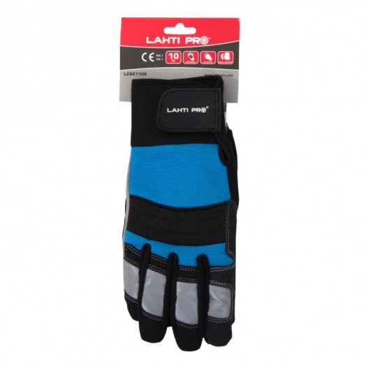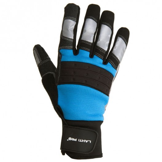 Material: elastan, microfibra, neopren, PVC. Straturi elastice de elastan pe portiunea dorsala a palmei pentru asigurarea unei potriviri perfecte. Numeroase intarituri din PVC pentru asigurarea unei rezistente ridicate la abraziune pe portiunea palmei, pe portiunea degetelor, din care intensificat pe portiunea degetului mare. Componente reflectorizante pentru o siguranta ridicata in cadrul utilizarii. Textura speciala pe portiunea laterala a degetului mare pentru asigurarea posibilitatii stergerii transpiratiei. Manseta reglabila cu arici, model cu mansete lungi. Destinat utilizarii in ateliere, depozite, constructii, transport, sport, recreatie. Standard: EN 420.