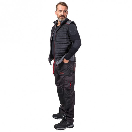 Material: - Invelis: poliester 100%, 70 g/m² si tesatura de tip SOFT-SHELL, 96% poliester, 4% elastan, 310 g/m². - Umplutura: 120 g/m². - Captuseala: taffeta, 50g/m² si micropolar, 160 g/m2. Insertii din material special triplu stratificat, cu membrana din poliuretan termoplastic (TPU), impermeabil (8000 mm), permeabil aer (3000 g/m²/24h), ce asigura un confort ridicat. 3 buzunare cu inchidere prin fermoar (2 externe si unul interior). Fermoar acoperit. Talie ajustabila. Standard EN ISO 13688.